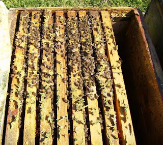 Kovanın dördüncü çıtası,bu şekilde polenli bir çıta olacak,daha önceden araştırıp bu kovana başka kovandan da polenli çıta getirilebilir.Bu kadar çok polenli çıta yoksa aşağıdaki gibi ballı ve polenli çıta konulacak.